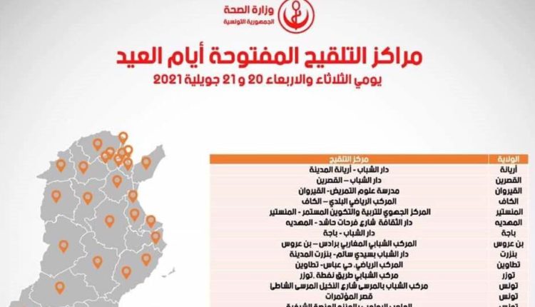 ويجدر الاشارة الى انّ هذه المراكز ستفتح ابوابها يوم الثلاثاء من الساعة الواحدة بعد الظهر (13.00) الى غاية الساعة السابعة مساء (19.00) ويوم الاربعاء من الساعة الثامنة صباحا (08.00) الى حدود الساعة السابعة مساء (19.00) لتطعيم المواطنين بالجرعة الأولى للقاح المضاد لفيروس كورونا.
