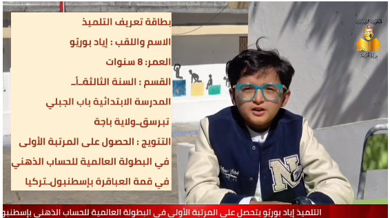 حقّق التلميذ إياد بوريّو، المرسم بالسنة الثالثة بالمدرسة الابتدائية “باب الجبلي” بتبرسق من ولاية باجة، إنجازاً دولياً متميزاً بحصوله على المرتبة الأولى في البطولة العالمية للحساب الذهني، وذلك ضمن فعاليات “قمة العباقرة الدولية 2026” التي احتضنتها مدينة إسطنبول التركية. وقد أعلنت وزارة التربية عن هذا التتويج الذي جاء بعد تفوق التلميذ، البالغ من العمر 8 سنوات، على عدد كبير من المشاركين من مختلف دول العالم في المسابقات التي انتظمت يوم 2 أفريل الجاري تحت إشراف خبراء دوليين في المجال.