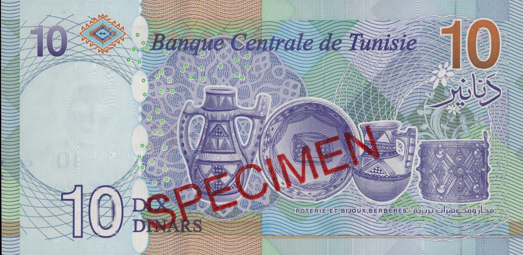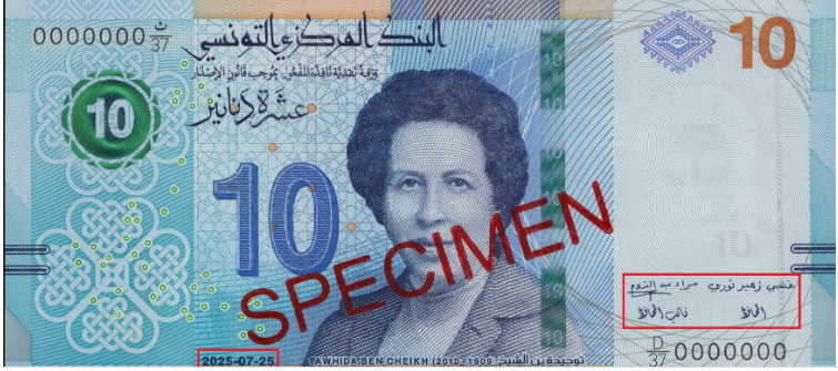 أعلن البنك المركزي التونسي عن طرح ورقة نقدية جديدة من فئة عشرة دنانير للتداول، بداية من تاريخ 17 أكتوبر 2025 (صنف 2020) لها الرواج القانوني والقوة الإبرائية وتحمل نفس التصاميم والخصائص وعلامات الأمان المعتمدة في الورقة النقدية المتداولة حالًيا من نفس الفئة والصنف باستثناء: