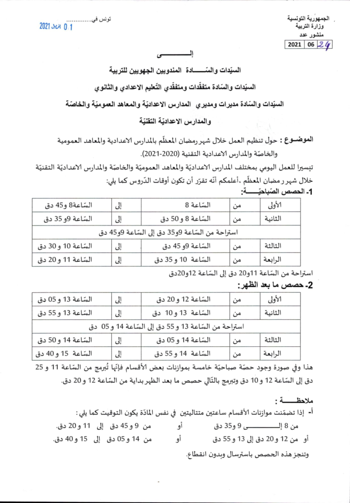 تنطلق حصص الدروس الصباحية بالمدارس الاعدادية والمعاهد الثانوية خلال شهر رمضان المعظم بداية من الساعة الثامنة صباحا و الى حدود الساعة الحادية عشر و 20 دقيقة في حين تمتد حصص ما بعد الظهر من الساعة منتصف النهار و 20 دقيقة و الى غاية الساعة الثالثة و 40 دقيقة بعد الزوال، حسب ما ورد في منشور وجهته وزارة التربية بداية أفريل الجاري الى مندوبياتها الجهوية.وأوصت الوزارة بضرورة أن يُلائم محتوى فروض المراقبة والاختبارات التوقيت المعمول به خلال شهر رمضان، وبضرورة اتخاذ الاجراءات اللازمة والكفيلة بتمكين المقيمين من الافطار عند آذان المغرب ومن تناول السحور في وقت مناسب يتم تحديده بالنظر إلى ظروف العمل التي تتوفر بالمؤسسة التربوية المعنية.