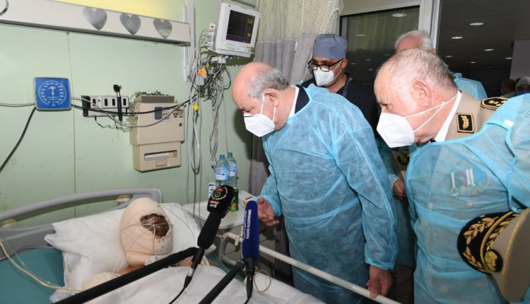 أدى الرئيس الجزائري عبد المجيد تبون، اليوم السبت 14 أوت 2021، زيارة إلى عدد من مصابي حرائق الغابات مدنيين وعسكريين، واطلع على حالاتهم الصحية وسير تعافيهم من إصاباتهم.
