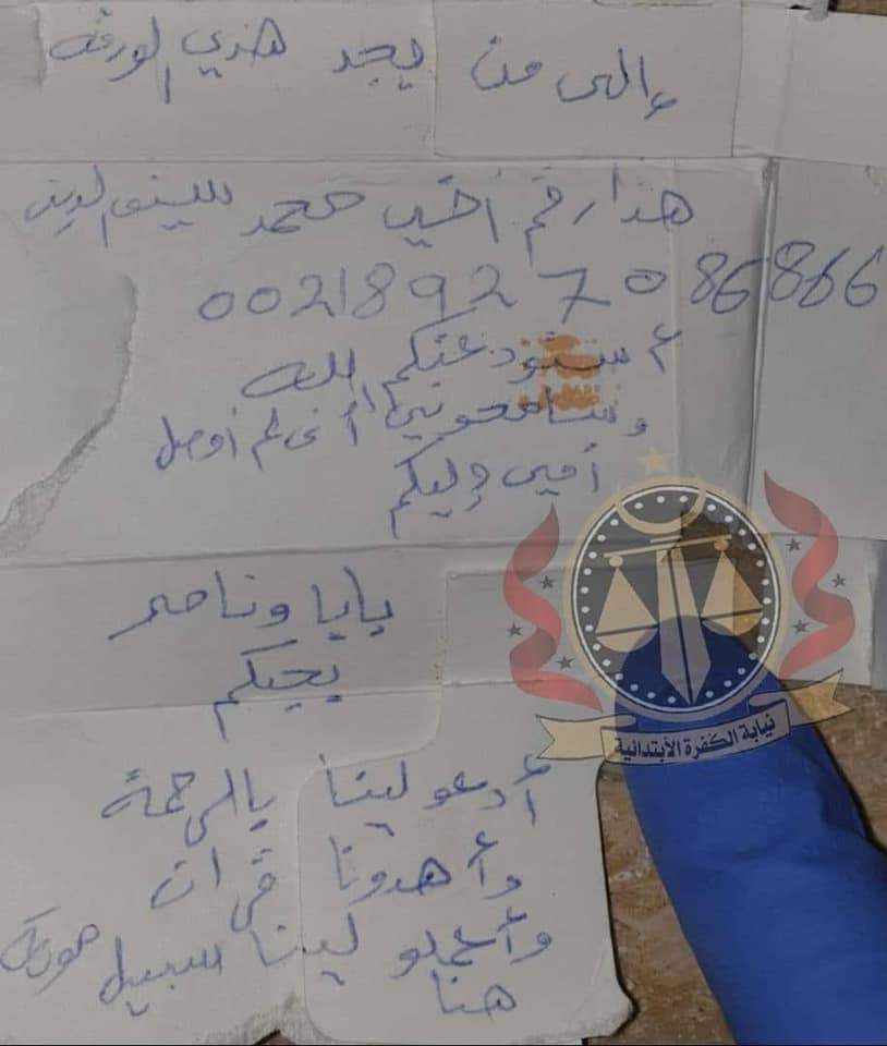 كما تم العثور على وصية مؤثرة في سيارة العائلة، ونشرتها نيابة الكفرة على حسابها بموقع فيسبوك، اليوم السبت 13 فيفري 2021، والتي جاء فيها:”إلى من يجد هذه الورقة، هذا رقم أخي محمد سيف الدين.. أستودعكم الله، وسامحوني أنني لم أصل أمي إليكم، بابا وناصر أحبكما، ادعوا لنا بالرحمة، واهدونا قرآنًا، واعملوا لنا سبيل موتة هنا”.
