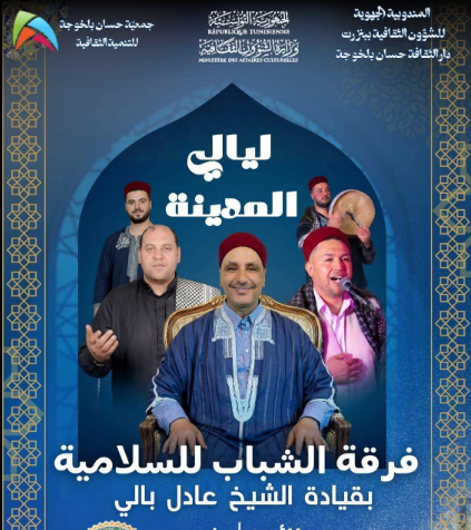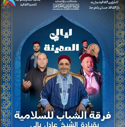 وفي سياق متصل، تستضيف دار الثقافة حسان بلخوجة برأس الجبل سهرة مخصصة للإنشاد الصوفي مع عرض “سلامية” تقدمه فرقة الشباب للسلامية بقيادة الشيخ عادل بالي، بداية من التاسعة ليلا أيضا. يذكر أن الدخول إلى كافة هذه العروض الثقافية بالجهة سيكون مجانياً للعموم.
