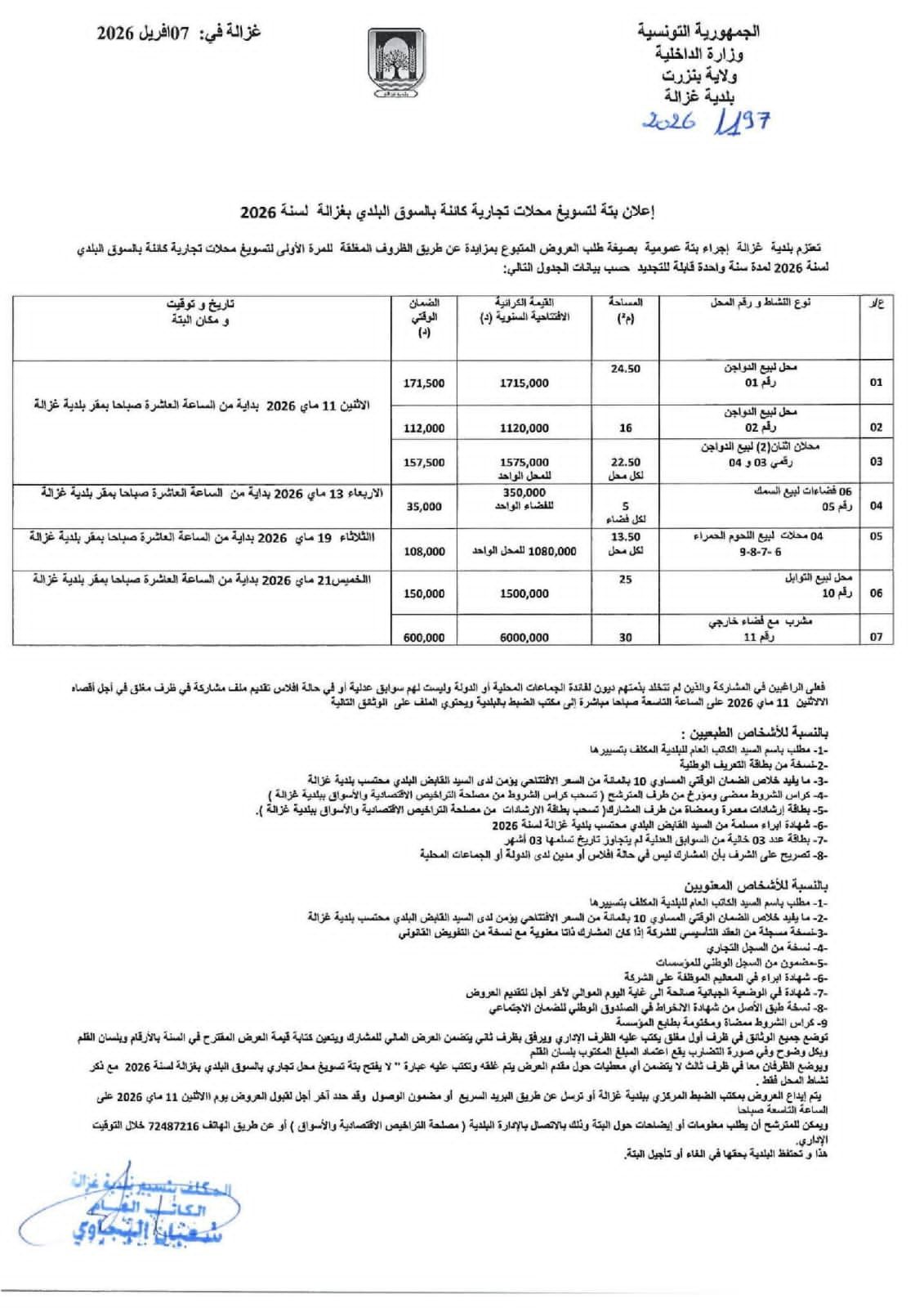 أعلنت بلدية غزالة عن اعتزامها إجراء بتة عمومية لسنة 2026، عن طريق تقديم عروض في ظروف مغلقة، لتسويغ مجموعة من المحلات التجارية الكائنة بالسوق البلدي بغزالة لمدة سنة واحدة قابلة للتجديد. وتشمل البتة أنشطة تجارية متنوعة، منها محلات لبيع الدواجن، فضاءات لبيع السمك، محلات لبيع اللحوم الحمراء، بالإضافة إلى محل لبيع التوابل ومشرب مع فضاء خارجي، بأسعار افتتاحية سنوية وقيم ضمان وقتي محددة حسب نوع النشاط ومساحة المحل.