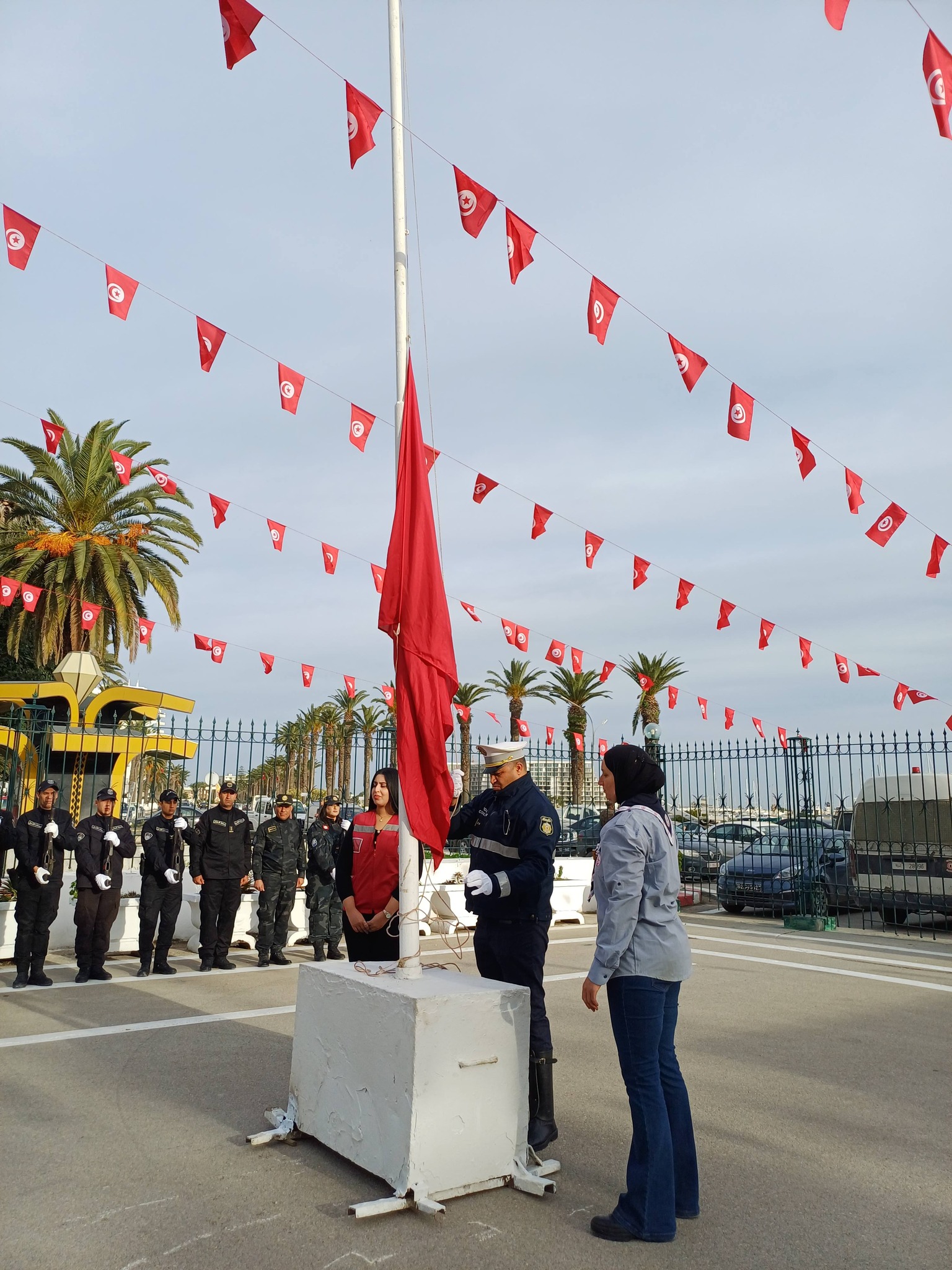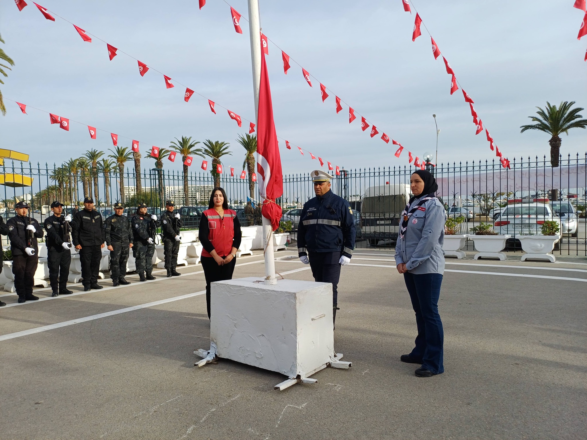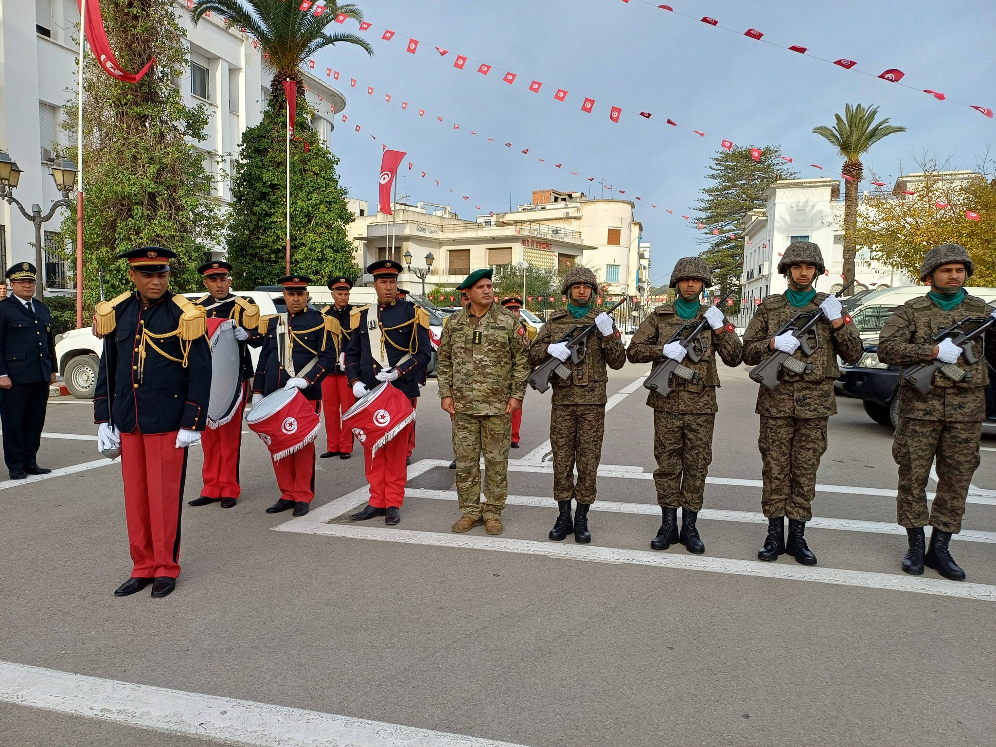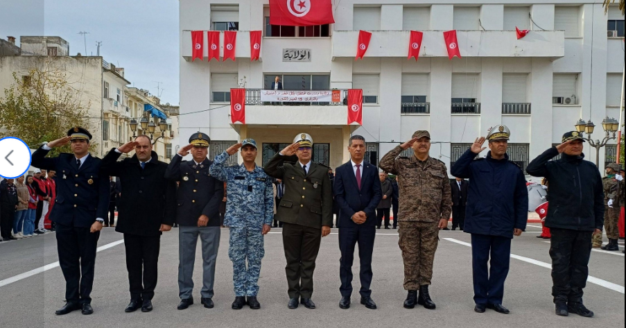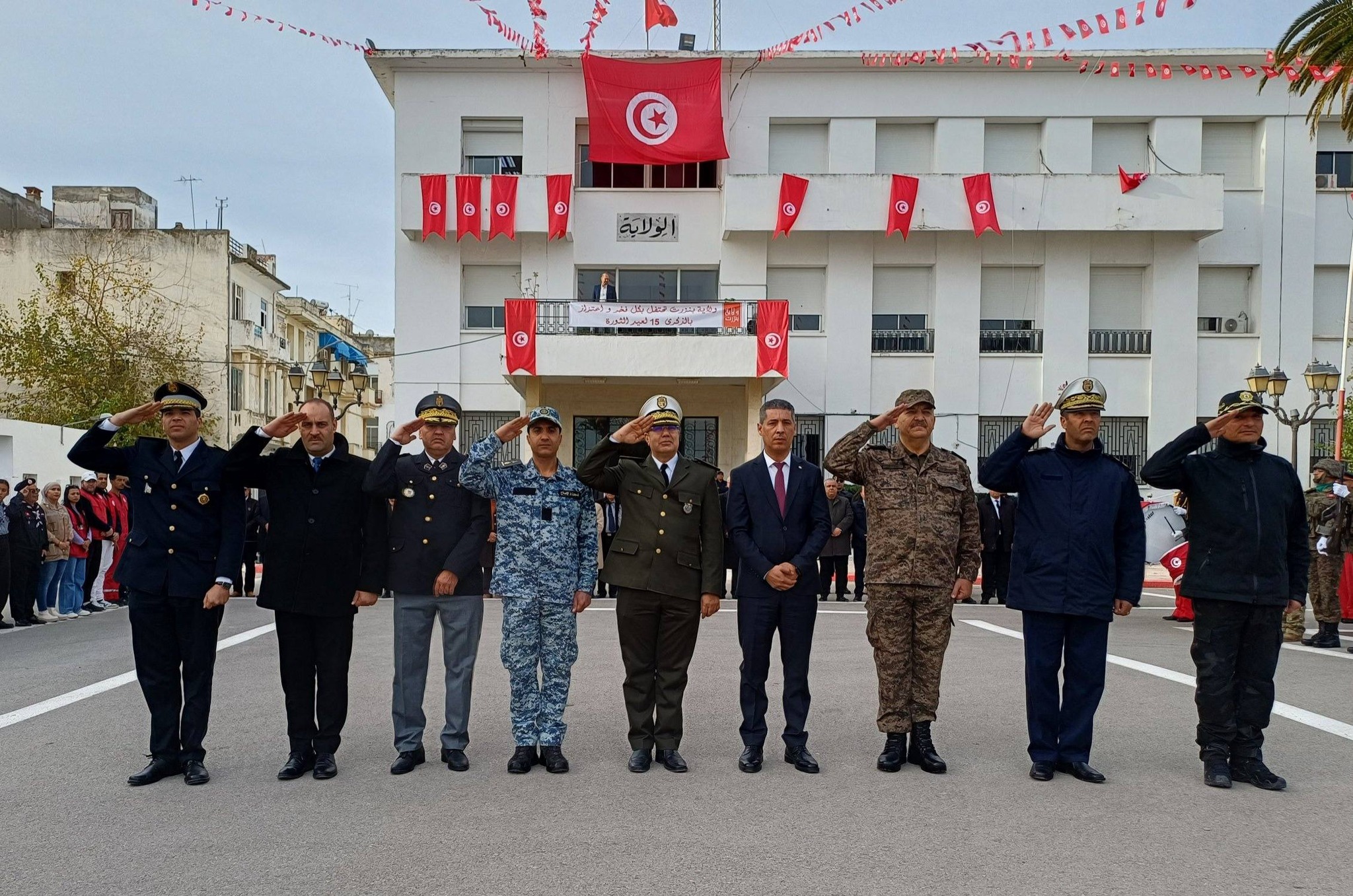 و تضمن الموكب الرسمي للاحتفال الجهوي ،الذي إنتظم امام مقر الولاية ، بإشراف والي بنزرت سالم بن يعقوب ، موكب وطني مهيب ومميز لتحية العلم المفدى على انغام النشيد الوطني بحضور الكاتب العام للولاية عبد اللطيف حميد وممثلي مختلف المكونات الرسمية والمنظماتية المهيكلة والمستقلة، وبمشاركة مختلف التشكيلات الأمنية والعسكرية والحماية المدنية .