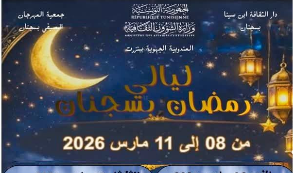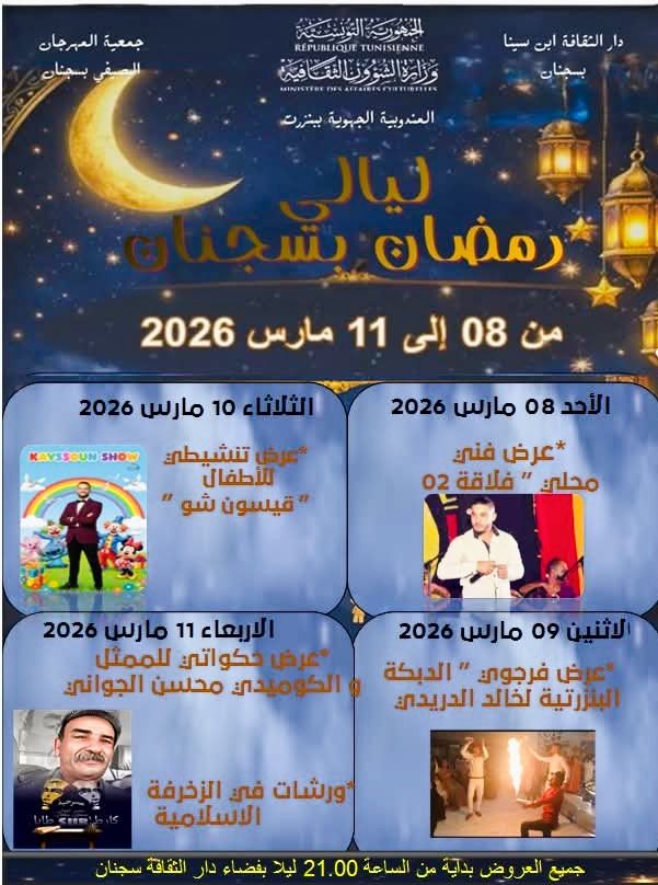 تنطلق بدار الثقافة “ابن سينا” بسجنان، وبدعم من المندوبية الجهوية للشؤون الثقافية ببنزرت، فعاليات التظاهرة الرمضانية “ليالي رمضان بسجنان” التي تشرف على تنظيمها جمعية المهرجان الصيفي بسجنان بالتعاون مع دار الثقافة بالجهة.