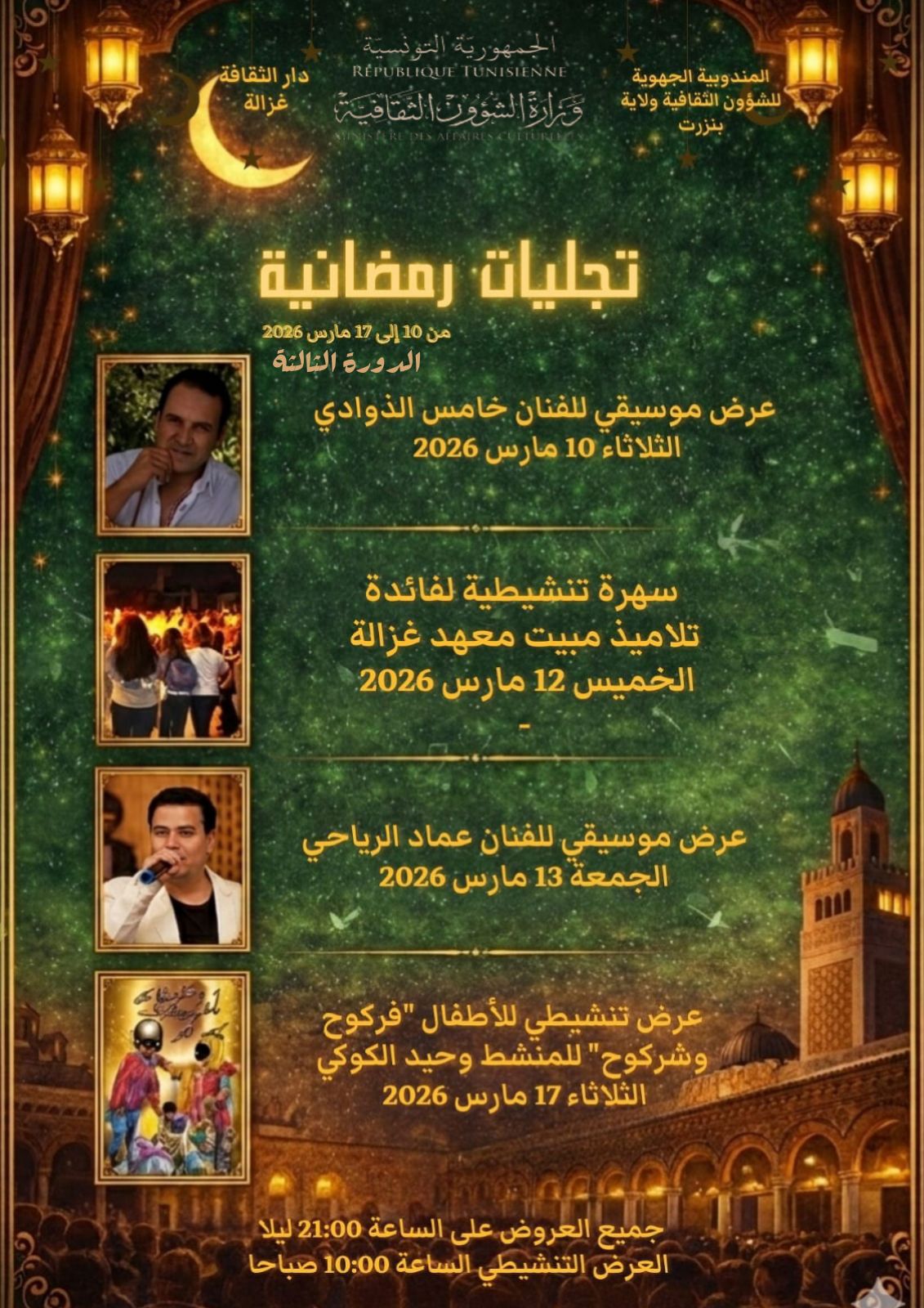 تحت إشراف المندوبية الجهوية للشؤون الثقافية ببنزرت، كشفت دار الثقافة غزالة عن البرنامج الرسمي للدورة الثالثة من تظاهرة “تجليات رمضانية” التي تمتد من 10 إلى 17 مارس 2026، حيث يفتتح المهرجان سهراته يوم الثلاثاء 10 مارس بعرض موسيقي للفنان خامس الذوادي، تليها سهرة تنشيطية لفائدة تلاميذ مبيت معهد غزالة يوم الخميس 12 مارس، ثم عرض موسيقي للفنان عماد الرياحي يوم الجمعة 13 مارس، ليُختتم البرنامج يوم الثلاثاء 17 مارس بعرض تنشيطي للأطفال بعنوان “فركوح وشركوح” للمنشط وحيد الكوكي؛ علماً وأن السهرات تنطلق في تمام الساعة التاسعة ليلاً (21:00)، باستثناء عرض الأطفال الذي يقام في العاشرة صباحاً (10:00).