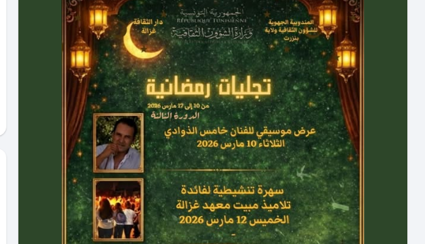 تحت إشراف المندوبية الجهوية للشؤون الثقافية ببنزرت، كشفت دار الثقافة غزالة عن البرنامج الرسمي للدورة الثالثة من تظاهرة “تجليات رمضانية” التي تمتد من 10 إلى 17 مارس 2026، حيث يفتتح المهرجان سهراته يوم الثلاثاء 10 مارس بعرض موسيقي للفنان خامس الذوادي، تليها سهرة تنشيطية لفائدة تلاميذ مبيت معهد غزالة يوم الخميس 12 مارس، ثم عرض موسيقي للفنان عماد الرياحي يوم الجمعة 13 مارس، ليُختتم البرنامج يوم الثلاثاء 17 مارس بعرض تنشيطي للأطفال بعنوان “فركوح وشركوح” للمنشط وحيد الكوكي؛ علماً وأن السهرات تنطلق في تمام الساعة التاسعة ليلاً (21:00)، باستثناء عرض الأطفال الذي يقام في العاشرة صباحاً (10:00).