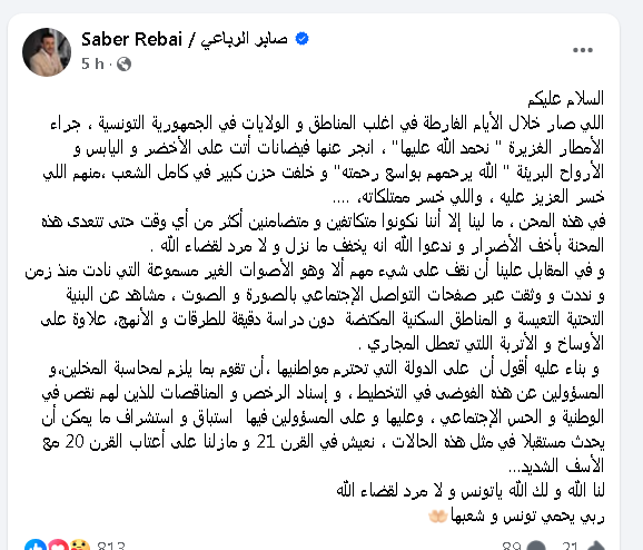 وجه الفنان التونسي الملقب بـ”أمير الطرب العربي”، صابر الرباعي، رسالة شديدة اللهجة ومؤثرة تعليقاً على موجة الفيضانات الأخيرة التي اجتاحت أغلب ولايات الجمهورية، مخلفة خسائر بشرية ومادية فادحة.