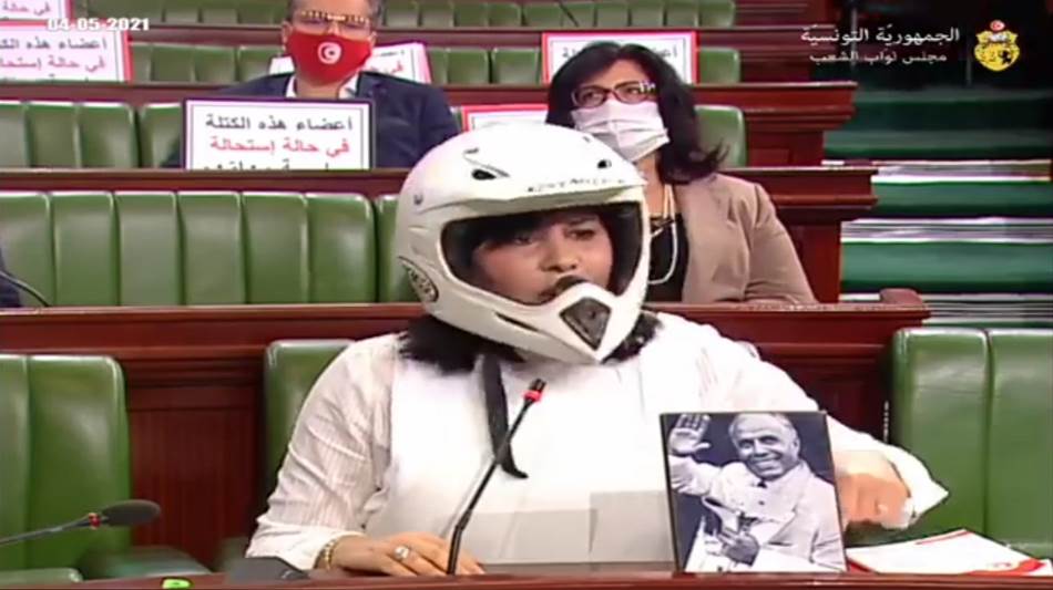 ظهرت النائب عبير موسي اليوم الثلاثاء خلال الجلسة العامة في البرلمان، مرتدية خوذة مخصصة للدراجات النارية وسترة.