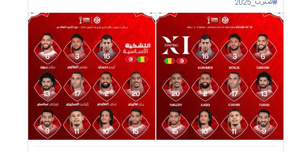 يواجه المنتخب الوطني التونسي اليوم منتخب مالي إنطلاقا من الساعة 20.00 على أرضية محمد الخامس بالدار البيضاء بإدارة الحكم الجنوب إفريقي توم أبو نجيل و ذلك ضمن ثمن نهائي بطولة كأس أمم أفريقيا 2025 المقامة حاليًا بالمغرب .