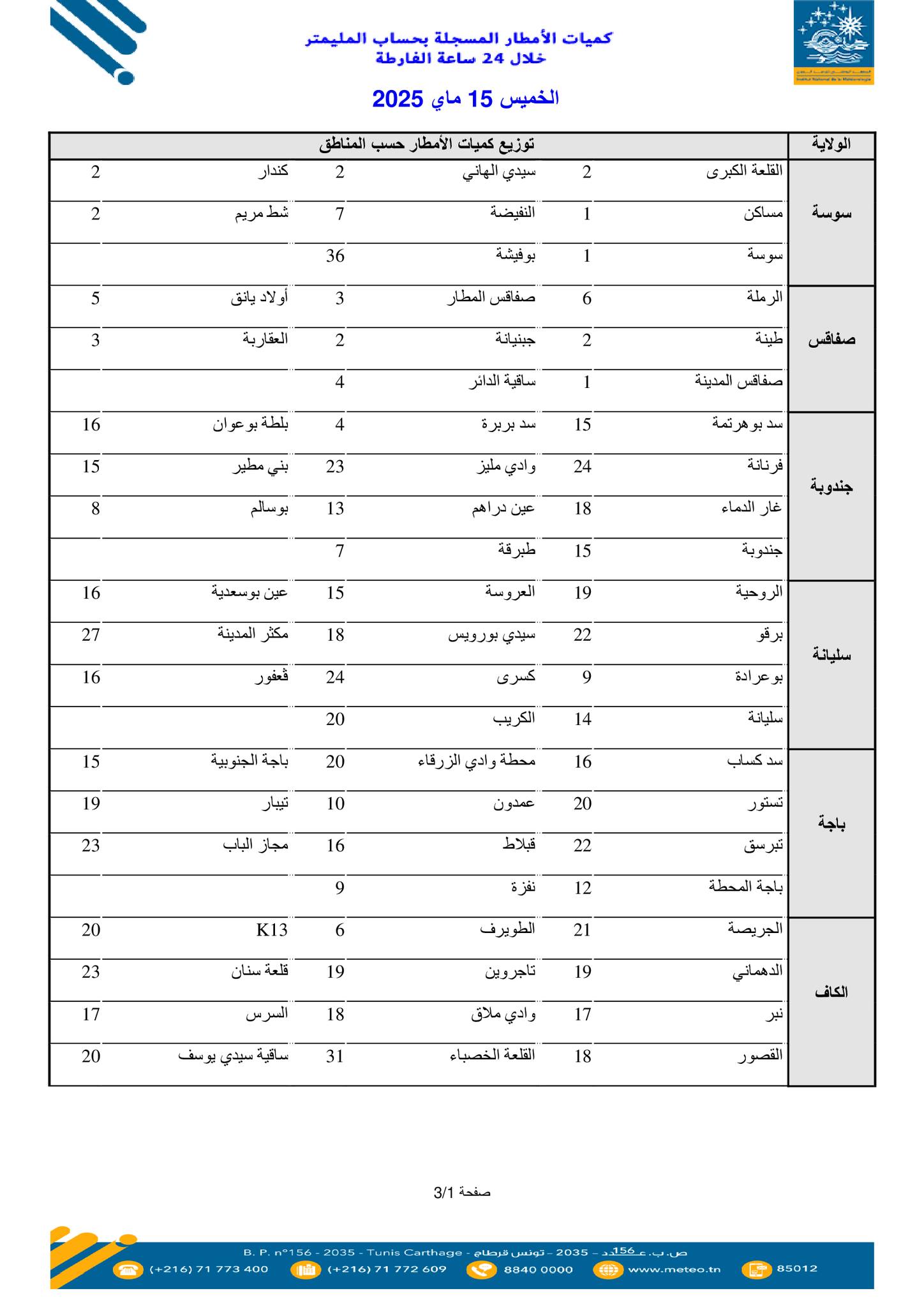 كما شهدت معتمدية بوفشية من ولاية سوسة تهاطل 36 مم فيما سجل تهاطل 27 مم في معتمدية مكثر من ولاية سليانة.