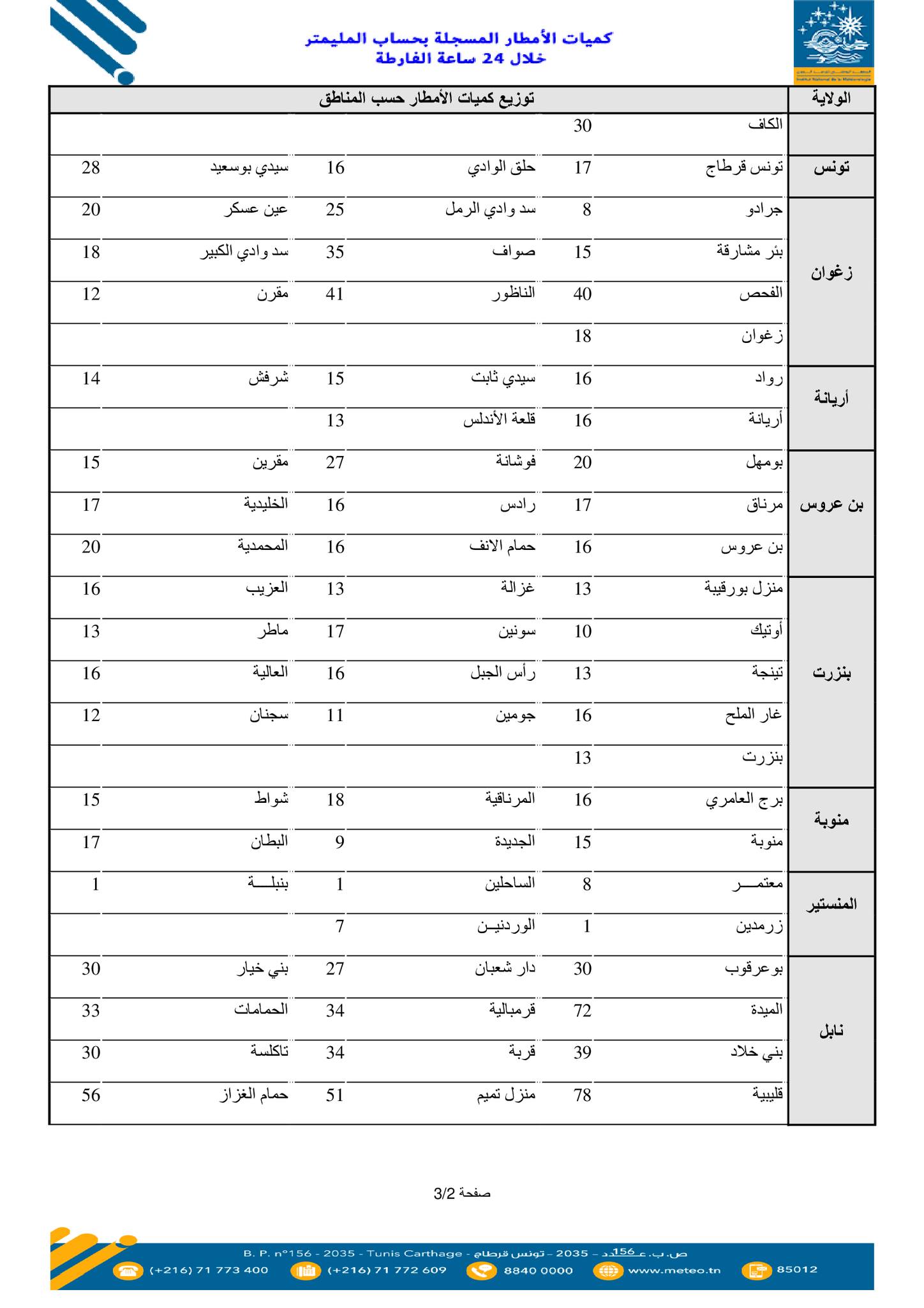 ووفق لمعهد الرصد الجوي يتواصل اليوم نزول الأمطار مؤقتا رعدية بالشّمال والوسط والجنوب الشّرقي وتكون غزيرة وبكميات محليا هامة خاصة بجهة الساحل والوطن القبلي وزغوان والقيروان، حيث تتراوح بين 40 و60 وتصل محليا إلى 80 مليمترا كما ينتظر هبوب رياح قوية تصل مؤقتا 70 كلم في الساعة بالجنوب والمرتفعات وأثناء ظهور السحب الرعدية مع انخفاض في الحرارة خاصّة بالشّمال والوسط.