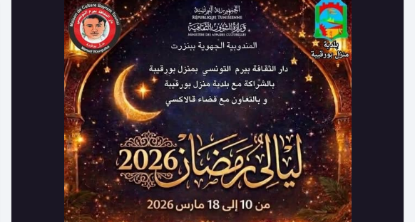 تستعد مدينة منزل بورقيبة لاحتضان فعاليات التظاهرة الرمضانية “ليالي رمضان 2026″، التي تنظمها دار الثقافة بيرم التونسي بالتعاون مع المندوبية الجهوية للشؤون الثقافية ببنزرت وبلدية المكان. وتتضمن البرمجة، التي تنطلق من 10 إلى 18 مارس الجاري بفضاء “قالاكسي” (Galaxy Palace)، سلسلة من السهرات الفنية المتنوعة التي تفتح أبوابها مجاناً للعموم.